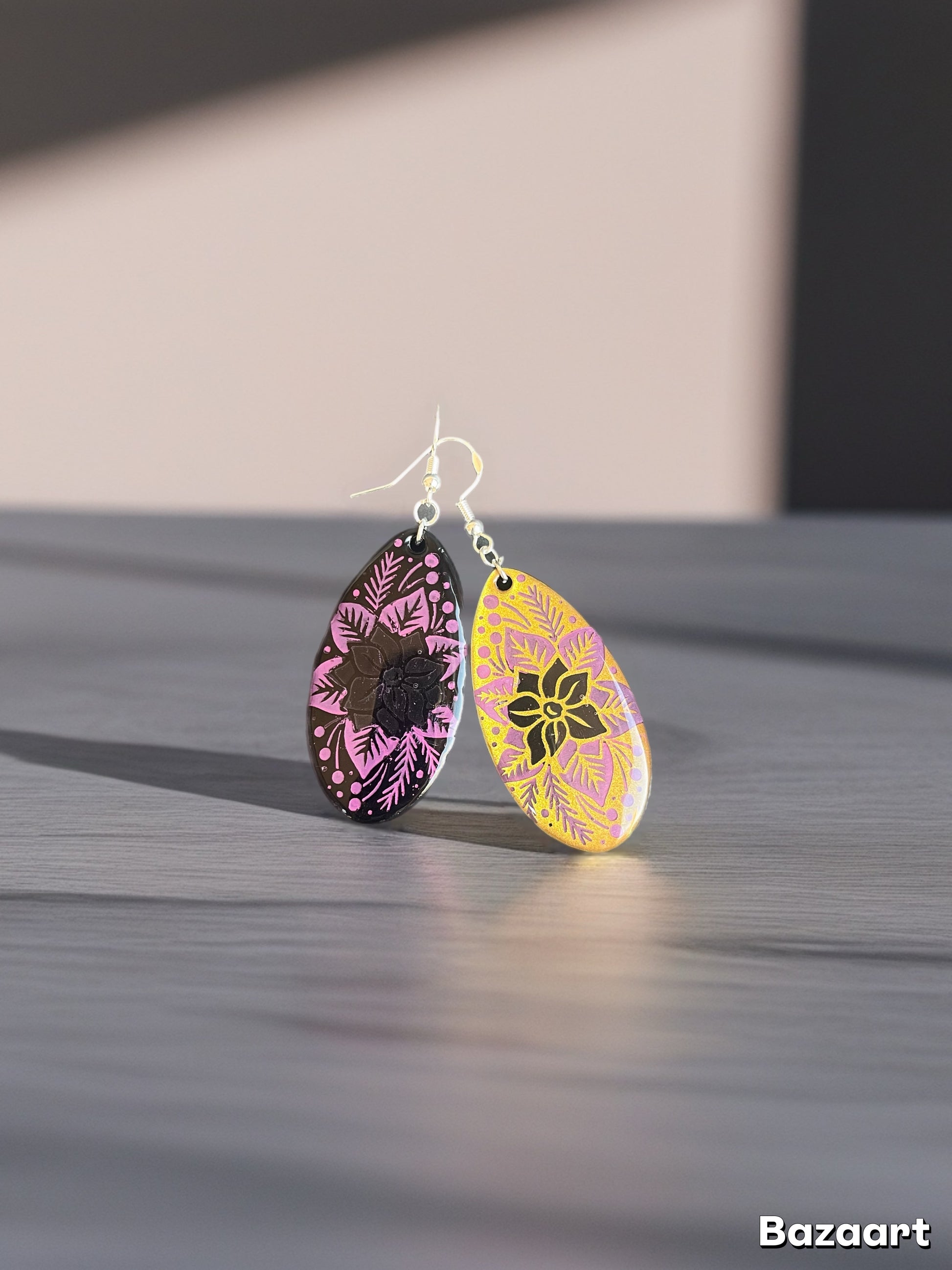 La composition florale élégante met en scène une fleur centrale stylisée entourée de feuilles délicates en forme de plumes et de points décoratifs. Chaque boucle offre un double visage : d’un côté, un fond noir profond sublimé par des motifs rose bonbon et mauve, de l’autre, un fond jaune soleil éclatant avec des motifs noirs contrastants. Cette dualité crée un effet visuel fascinant et permet de varier les styles selon l’humeur du jour. Les teintes vives et contrastées évoquent la joie et l’énergie créative. La forme en goutte allongée apporte une élégance moderne et audacieuse.