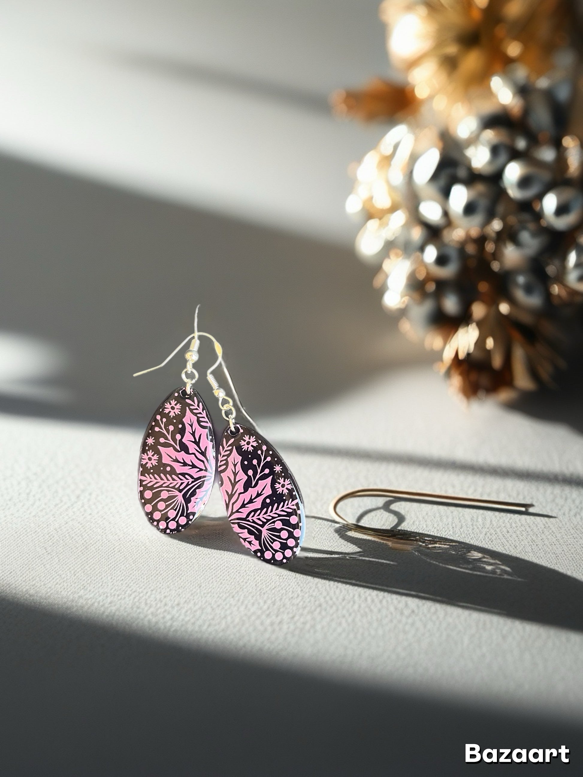 Délicates boucles d’oreilles en forme de goutte allongée, réalisées en acrylique gravé au laser, peintes à la main puis résinées. Chaque pièce arbore un élégant motif floral sur fond noir profond, sublimé par des teintes roses douces et romantiques.
