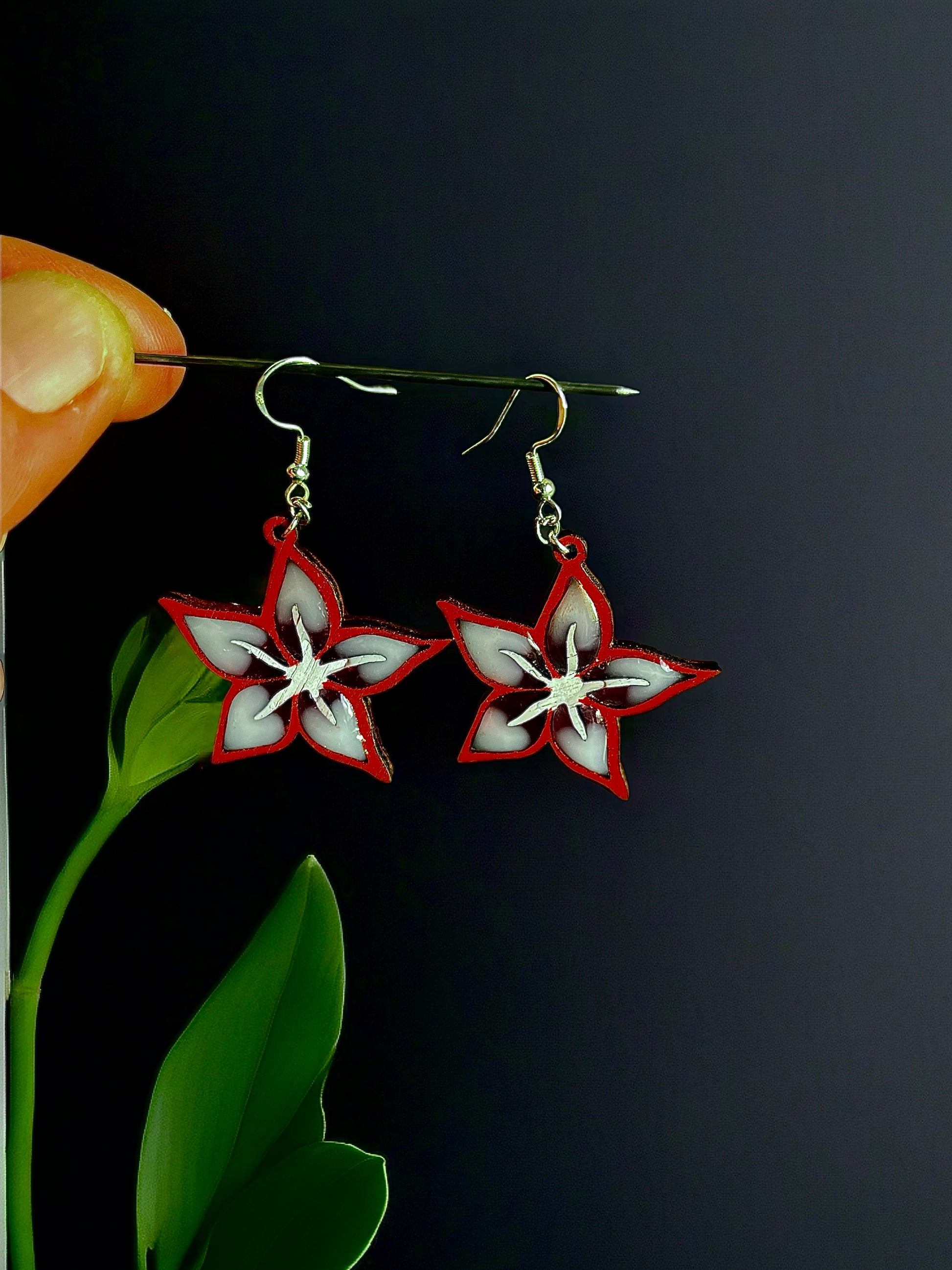 Élégantes boucles d’oreilles en forme de fleur tropicale à cinq pétales, réalisées en bois léger, peintes à la main puis résinées. Design inspiré de la fleur de frangipanier avec un effet multicouche sophistiqué.