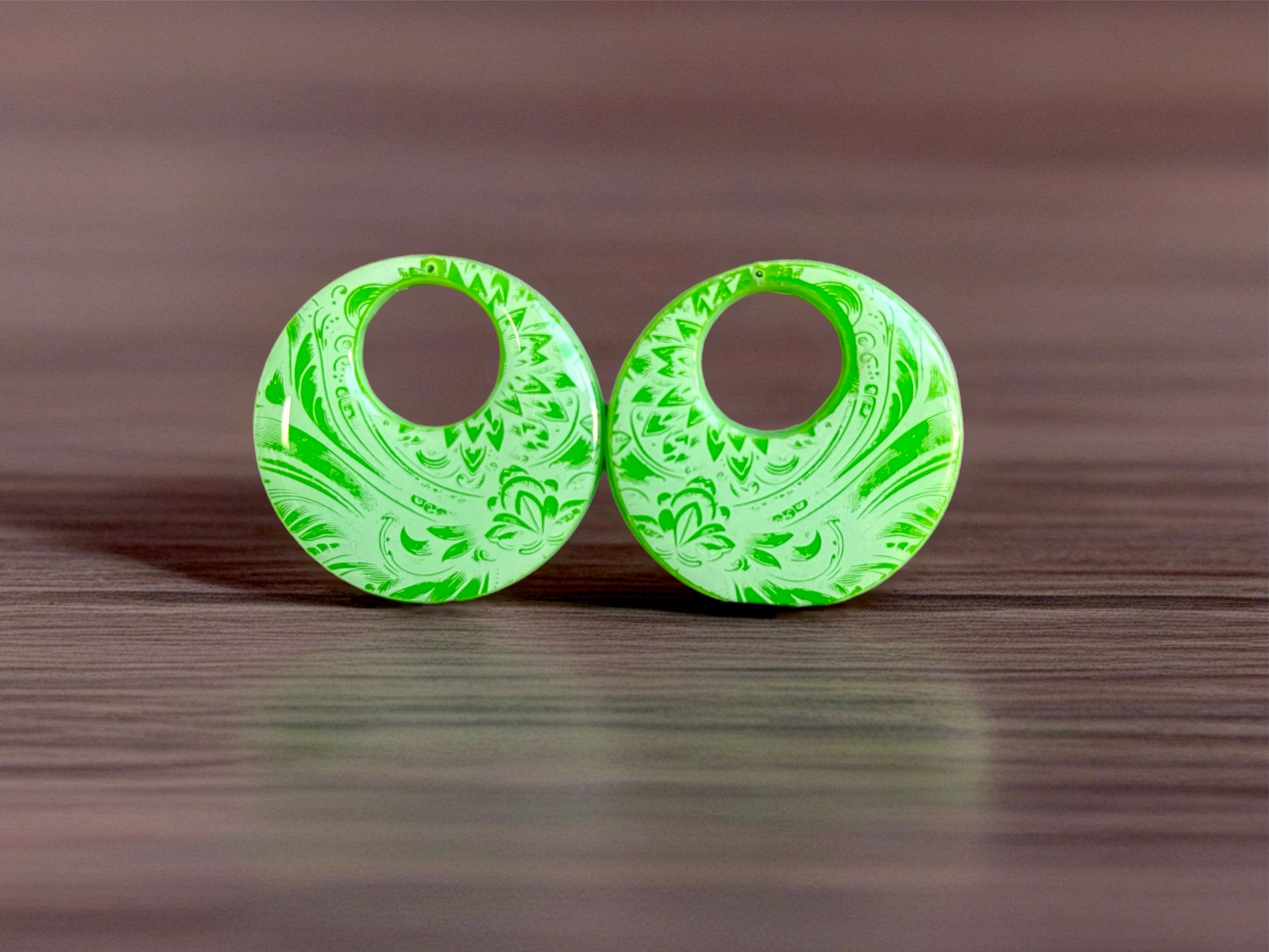 Ces superbes pampilles évoquent l’élégance des ornements floraux classiques. Chaque pampille est découpée dans de l’acrylique de qualité, puis gravée avec un motif arabesque sophistiqué mêlant volutes gracieuses, motifs géométriques et éléments floraux stylisés. Le design présente un travail de gravure d’une finesse exceptionnelle avec des courbes fluides et des détails délicats. La couleur vert anis lumineux contraste magnifiquement avec les gravures blanches nacrées, créant un effet de relief et de profondeur captivant. L’ensemble est ensuite résiné pour une finition brillante et protectrice qui sublime chaque détail de la gravure.