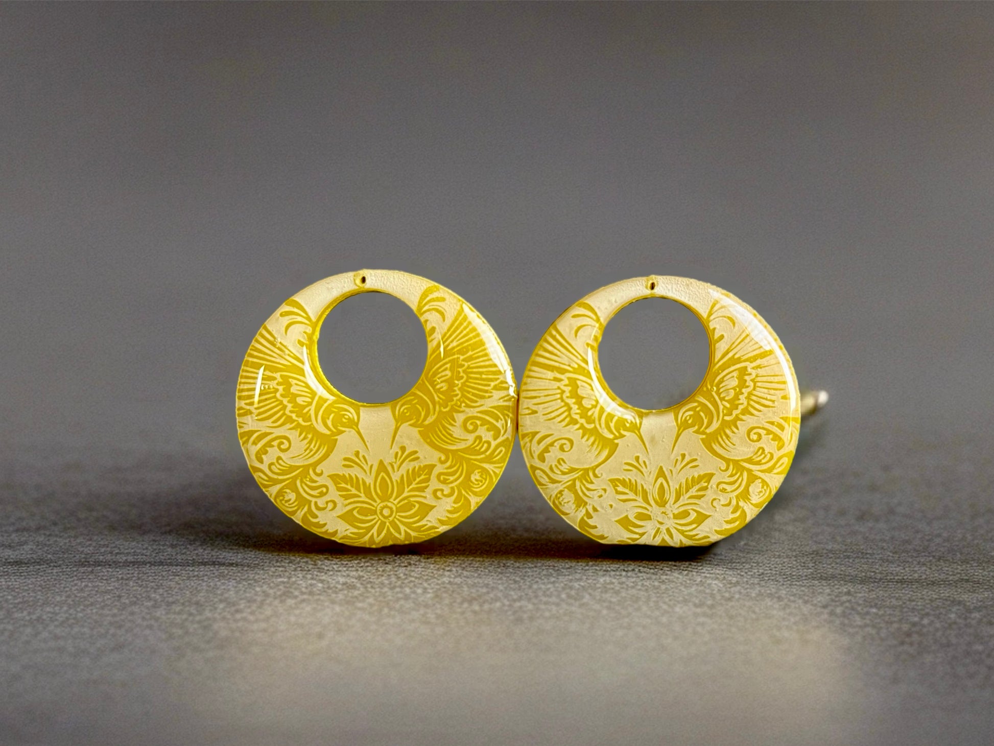 Ces majestueuses pampilles célèbrent la grâce des oiseaux dans un écrin floral doré. Chaque pampille est découpée dans de l’acrylique de qualité, puis gravée avec un motif enchanteur mettant en vedette deux oiseaux stylisés se faisant face, entourés de motifs floraux délicats et de volutes gracieuses. Le design présente une fleur centrale ornée et des détails d’une finesse exceptionnelle : plumage rayonnant, arabesques et éléments végétaux s’entrelacent harmonieusement. La couleur dorée lumineuse contraste superbement avec les gravures beiges nacrées, créant un effet de relief précieux et chaleureux. L’ensemble est ensuite résiné pour une finition brillante et protectrice qui sublime chaque détail.