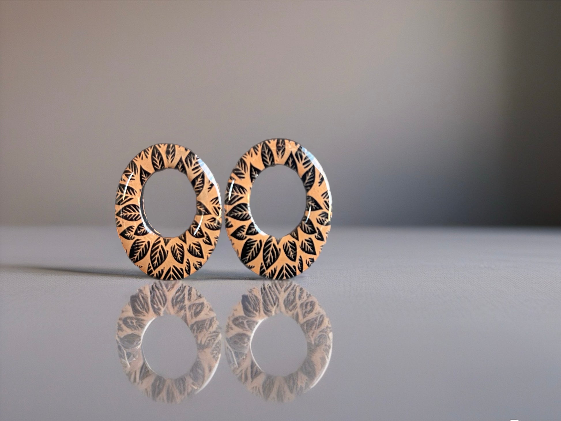 La composition botanique élégante présente une couronne harmonieuse de feuilles stylisées disposées tout autour de l’anneau ovale, créant un effet de dentelle végétale raffinée. La palette de couleurs joue sur des nuances de cuivre doré, pêche rosé et beige chaud contrastant avec des détails noirs, créant un effet automnal sophistiqué et chaleureux. L’ouverture centrale ovale allongée apporte une touche d’élégance et permet un jeu subtil de lumière à travers le bijou. Le motif répétitif de feuilles crée un rythme visuel apaisant et naturel. La forme ovale verticale sublime l’oreille avec douceur et élégance intemporelle.