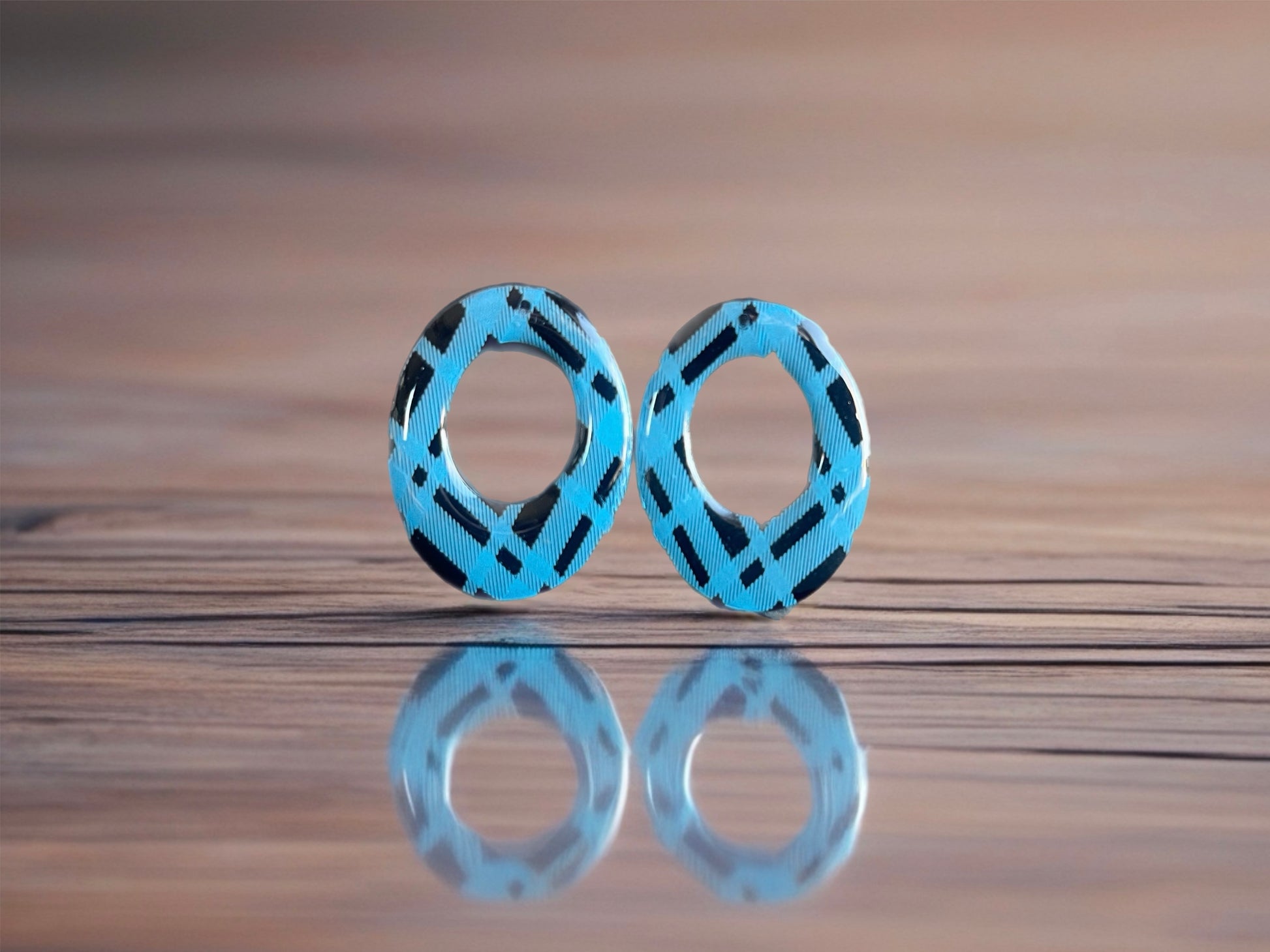 Le motif animalier audacieux présente des taches de léopard stylisées disposées de manière contemporaine tout autour de l’anneau ovale, créant un effet sauvage et sophistiqué. La palette de couleurs joue sur un turquoise éclatant et un bleu cyan vif contrastant avec des taches noires graphiques, pour un rendu résolument moderne et énergique. L’ouverture centrale ovale allongée apporte élégance et permet un magnifique jeu de lumière. Le motif léopard revisité dans ces teintes non conventionnelles crée une version fraîche et originale du classique imprimé animalier. La forme ovale verticale sublime l’oreille avec dynamisme.
