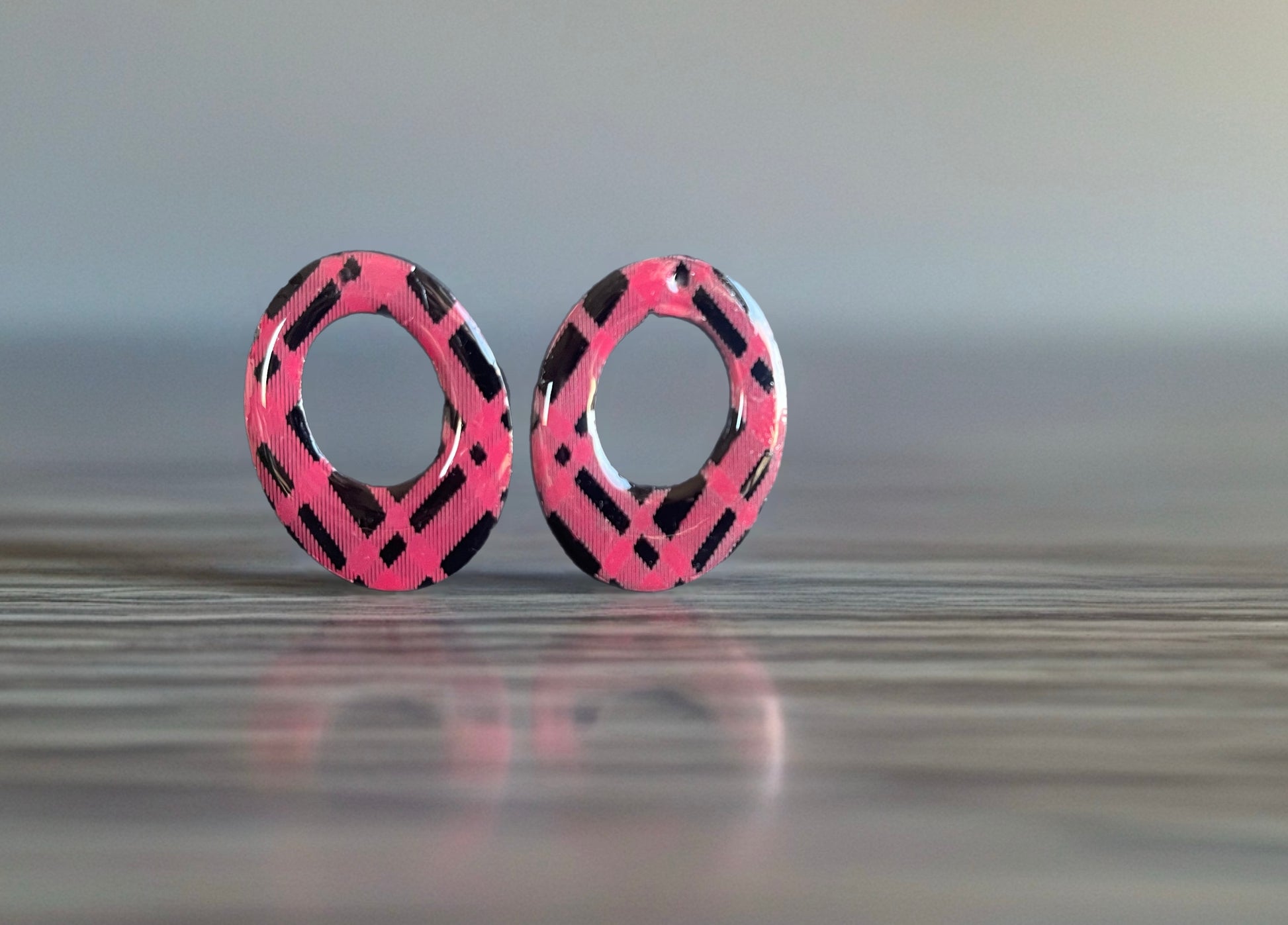 Le motif animalier flamboyant présente des taches de léopard stylisées disposées de manière graphique tout autour de l’anneau ovale, créant un effet sauvage et glamour. La palette de couleurs joue sur un rose corail éclatant, presque néon, avec des nuances de rose vif et fuchsia contrastant avec des taches noires audacieuses, pour un rendu résolument contemporain et énergique. L’ouverture centrale ovale allongée apporte élégance et permet un magnifique jeu de lumière. Le motif léopard revisité dans ces teintes roses vibrantes crée une version ultra-féminine et décalée du classique imprimé animalier. La forme ovale verticale sublime l’oreille avec audace et féminité assumée.