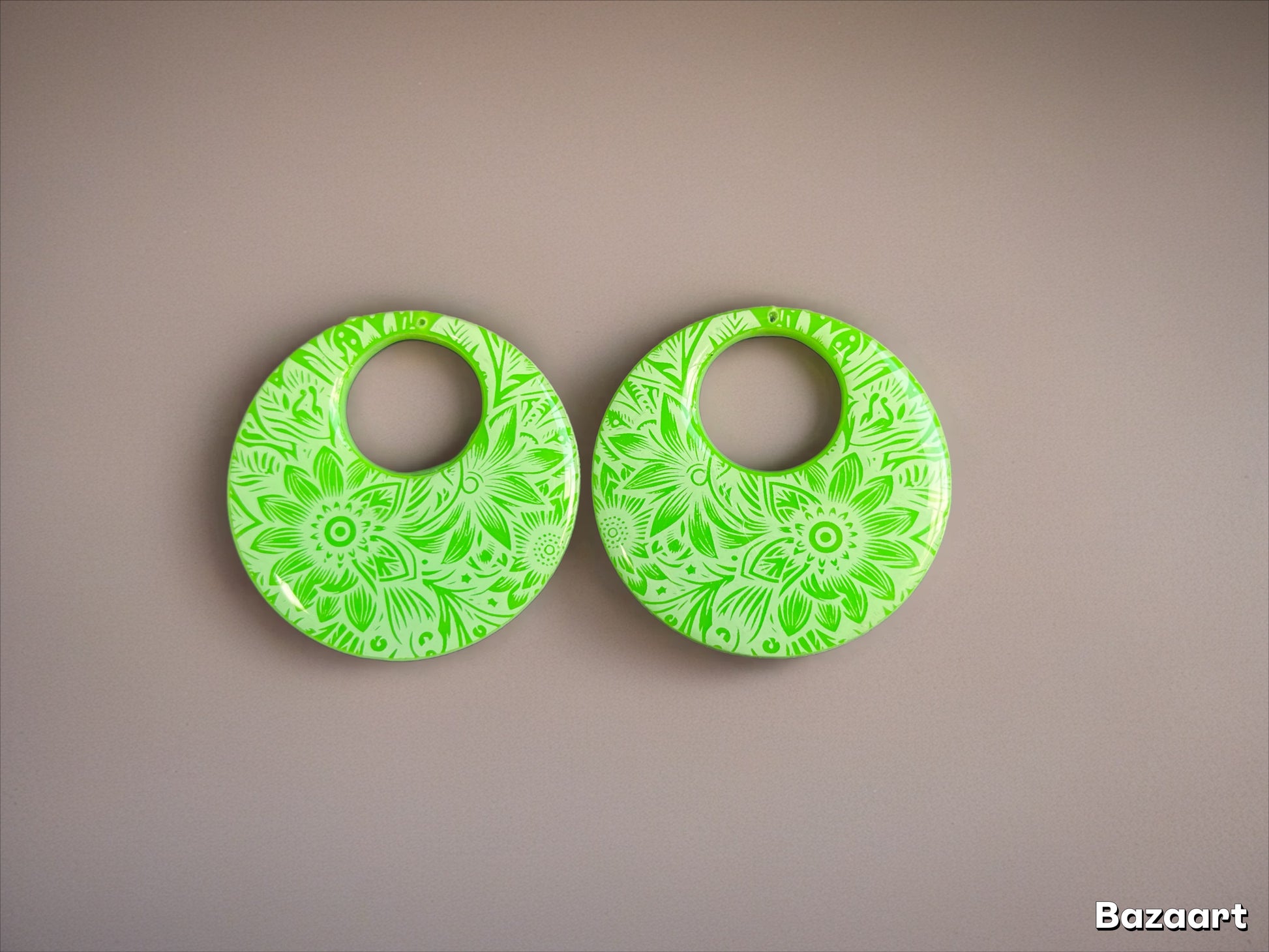 Ces superbes pampilles évoquent la beauté d’un jardin luxuriant. Chaque pampille est découpée dans de l’acrylique de qualité, puis gravée avec un motif floral mandala extrêmement détaillé et sophistiqué. Le design présente des fleurs géométriques, des feuilles délicates et des motifs paisley entrelacés dans un style bohème chic harmonieux. La couleur vert anis éclatant contraste élégamment avec les gravures qui révèlent le blanc nacré de l’acrylique, créant un effet de profondeur et de relief captivant. L’ensemble est ensuite résiné pour une finition brillante et protectrice qui sublime chaque détail de la gravure.