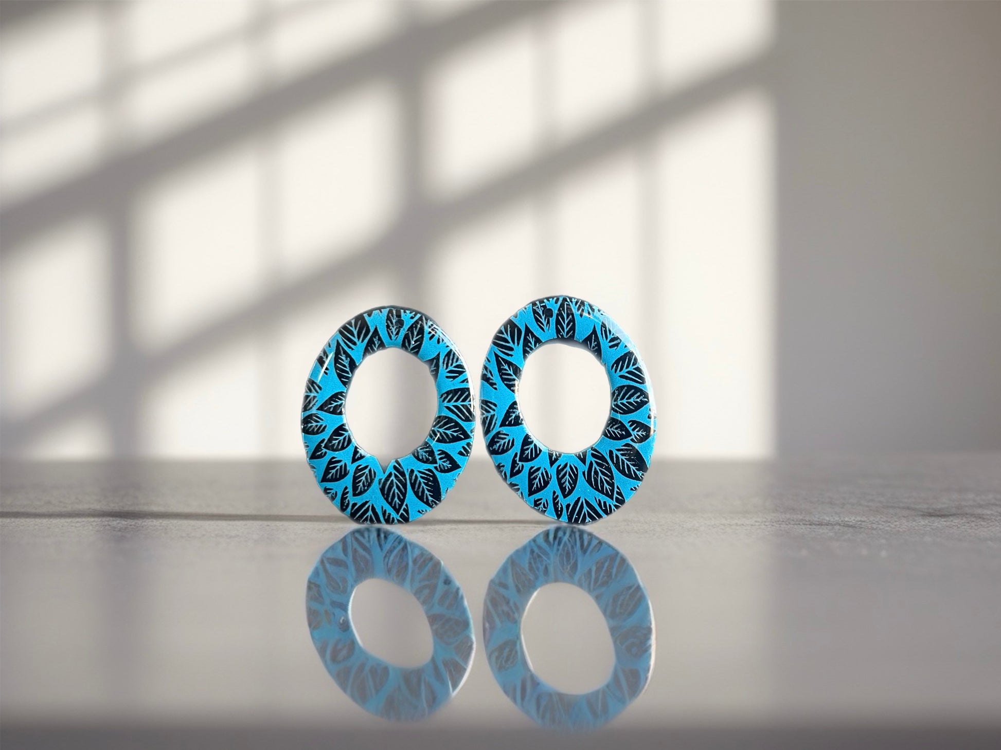 La composition végétale délicate présente un motif de feuilles stylisées disposées en couronne harmonieuse tout autour de l’anneau ovale, créant un effet de dentelle naturelle raffinée. La palette de couleurs joue sur des nuances de turquoise éclatant et bleu cyan sur fond noir profond, créant un contraste saisissant et contemporain. L’ouverture centrale ovale allongée apporte une touche d’élégance et permet un jeu subtil de lumière à travers le bijou. Le motif répétitif de feuilles crée un rythme visuel harmonieux et apaisant. La forme ovale verticale sublime l’oreille avec sa silhouette allongée flatteuse.